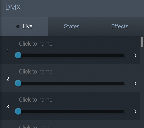 DMX Effects are sequences of values and/or states which are made up of a series of steps. This is commonly used to create lighting animations.