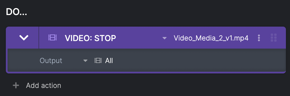 - Chose the output - that the video will stop on, which includes all outputs. This is useful if you have the same file playing on multiple devices and you want to chose which ones to stop on, or stop all of them. If an Video play action for this file happens after this point, the file will play from the beginning.