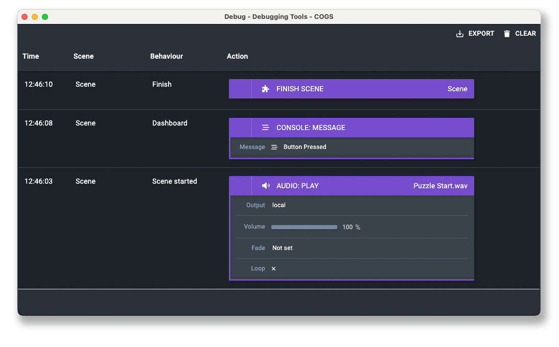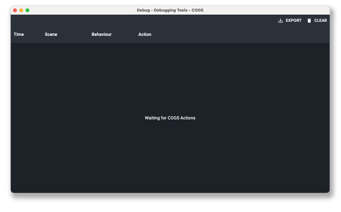 When you're building your show, you may find that you're building lots of behaviours or need to debug why an action runs when you might not expect it to. In COGS v5.3 we've introduced our Actions Debugging tool. This tool allows you to view a log of all of your actions that run and will display what time, scene, behaviour, and action was run.
